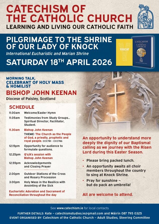 Ogonnelloe Easter Ceremonies: April 3rd Good Friday in St Mary’s Church at 3pm; Stations at the entrance to Hill Cemetery at 7pm. The collection at the 5th Station will be for St Vincent De Paul. April 4th Easter Vigil in St Molua’s Church at 8pm. Reminder to bring your own bottle for Easter Water please.